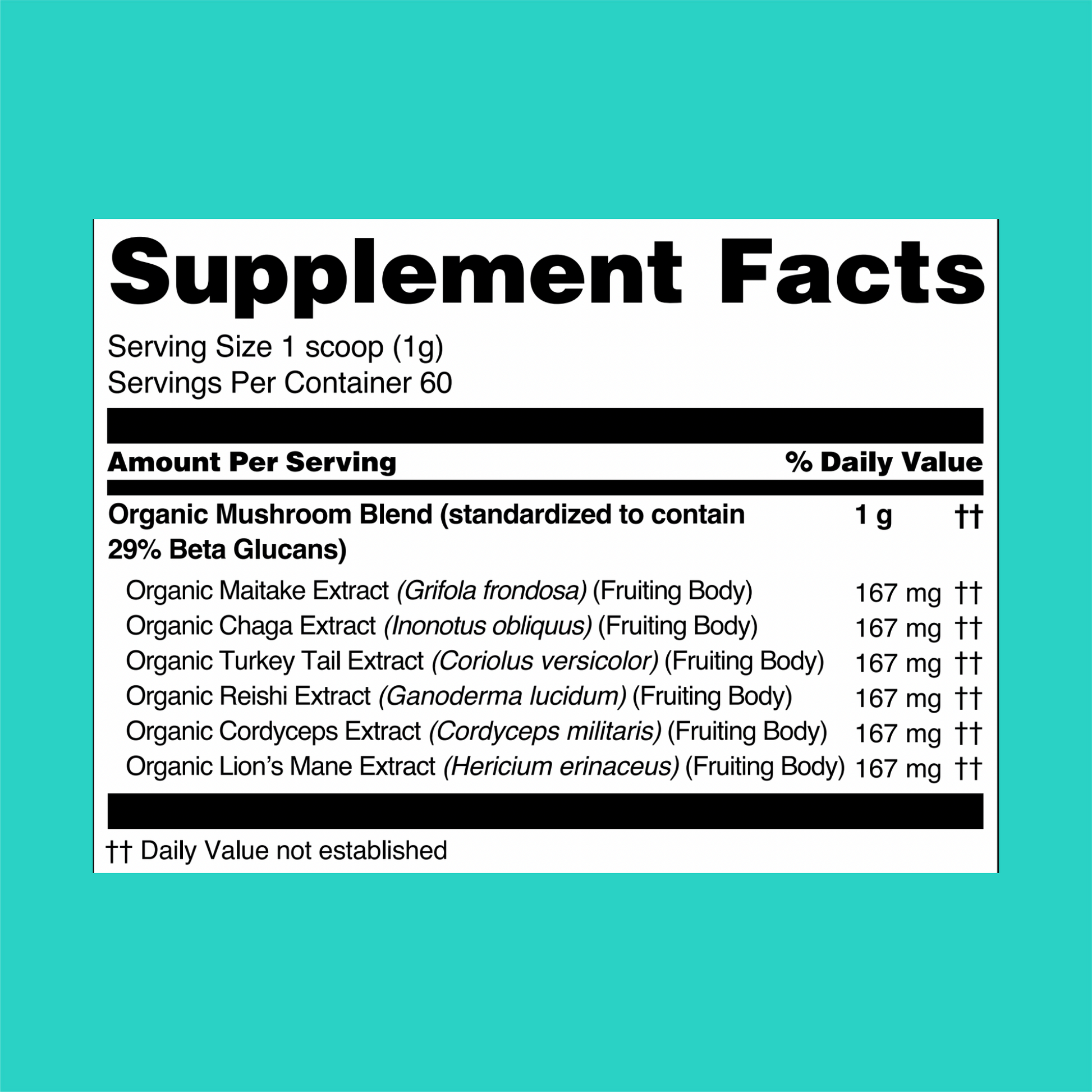 The fruiting body is the part of the mushroom that you see, the actual “mushroom”. Believe or not, many companies sell “mycelium on grain” or the “roots” of the mushroom that typically grows underground. The problem is that these “mycelium on grain” supplements contain only trace amounts of the beneficial compounds you’re looking for in a mushroom supplement. If you are looking for the real benefits of mushrooms, make sure the supplement is made from “whole fruiting body”.